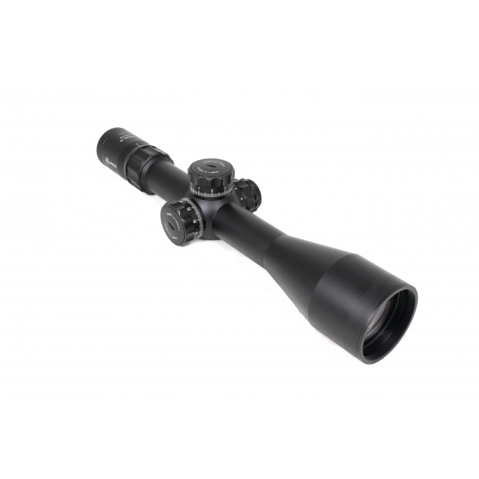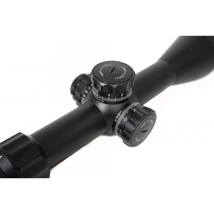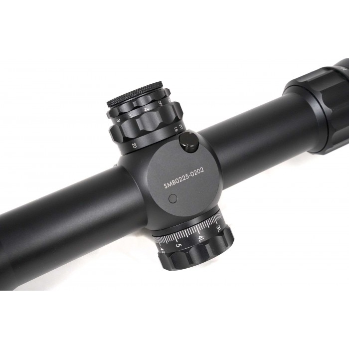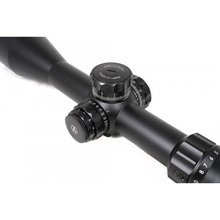 Баллистическая сетка MA20-MRAD выгравирована на стекле и размещена в первой фокальной плоскости, благодаря чему угловые размеры между делениями сохраняются на любом увеличении. Это даёт возможность точно вводить поправки по дальности и ветру без пересчётов и использовать сетку для оценки дистанции по габаритам цели. Красная подсветка с десятью уровнями яркости обеспечивает хорошую видимость при любом освещении, а питание осуществляется от стандартной батареи CR2032. Боковая отстройка параллакса позволяет добиться чёткого изображения на разных дистанциях, начиная примерно с 14 метров и до бесконечности.