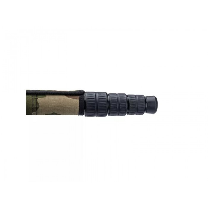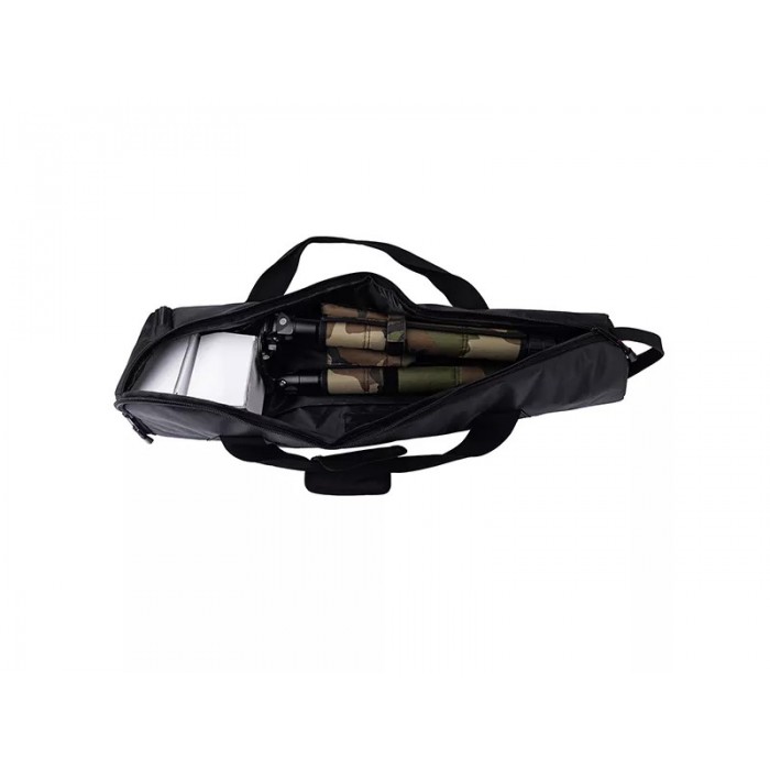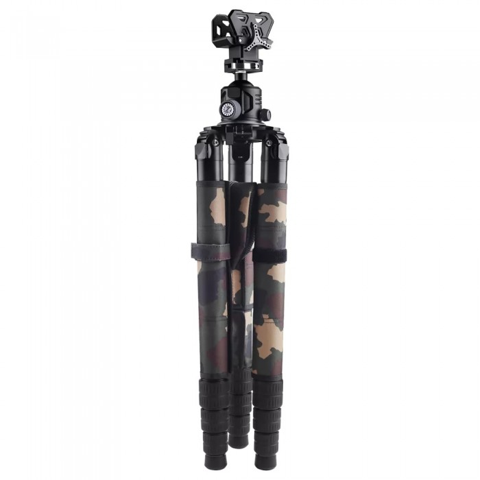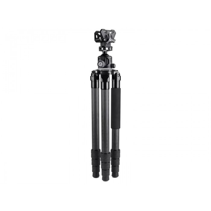 Основа конструкции выполнена по классической схеме с тремя ножками и центральной платформой для крепления оборудования. Ноги изготовлены из карбона Toray 40T с диаметром секций 40, 36, 32 и 28 мм, что обеспечивает высокую жёсткость и устойчивость при сравнительно небольшой массе. Центральный узел и элементы площадки выполнены из авиационного алюминиево-магниевого сплава T6, устойчивого к нагрузкам и деформации. При собственной массе 2580 г трипод рассчитан на нагрузку до 30 кг и эффективно гасит вибрации, что особенно важно при стрельбе и работе с длиннофокусной оптикой.