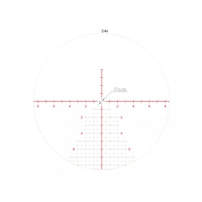 Прицельная сетка AM424 расположена в первой фокальной плоскости и масштабируется вместе с увеличением, поэтому разметка сохраняет корректность на всём рабочем диапазоне. На 4x Т-образное перекрестие помогает быстро захватить цель, а на 24x лучше читается разметка по обеим осям и вертикальная «ёлочка» для оперативного ввода поправок непосредственно перед выстрелом. Подсветка имеет 11 уровней яркости и промежуточные положения, чтобы одним движением отключать подсветку и так же быстро возвращаться к ранее выбранной яркости. Также указано автоматическое отключение подсветки при бездействии, что помогает экономить ресурс питания.
