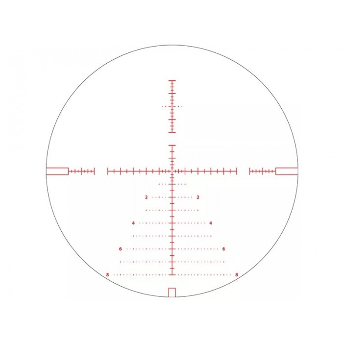 Прицельная сетка AM1 расположена в первой фокальной плоскости и масштабируется вместе с увеличением, поэтому разметка сохраняет корректность на всём диапазоне кратности. Разметка по обеим осям и «ёлочка» позволяют вводить поправки по дальности и ветру прямо в процессе стрельбы, не теряя темп. Диоптрийная коррекция −3 / +2 помогает подстроить резкость под зрение, чтобы прицельная картинка оставалась чёткой при длительном наблюдении.