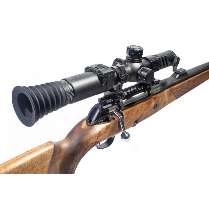 Сенсор 2K с чувствительностью 0,001 люкс обеспечивает высокую детализацию при низком освещении, превосходящую Full HD-модули. Экран IPS 800×800 обеспечивает комфортное восприятие круглого выходного зрачка и регулируемую яркость по 6 уровням, что снижает усталость глаз при длительной работе. Ночная цветовая схема включает три палитры: чёрно-белую для контраста, зелёную для комфортного восприятия и жёлтую для улучшения видимости в тумане или дождливую погоду. Для наблюдений в полной темноте требуется внешний ИК-осветитель, который приобретается отдельно.
