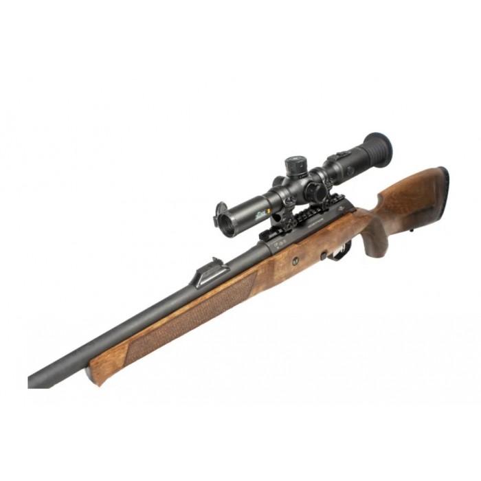 Прибор позволяет изменять яркость, контраст и тонировку экрана. Это особенно полезно при смене условий — например, при переходе из туманного участка в сухой лес или при стрельбе в сумерках. Дополнительная регулировка диоптрий от −5 до +5 помогает адаптировать картинку под зрение стрелка, а боковая фокусировка обеспечивает точное наведение на дистанциях от 5 метров до предельных значений.