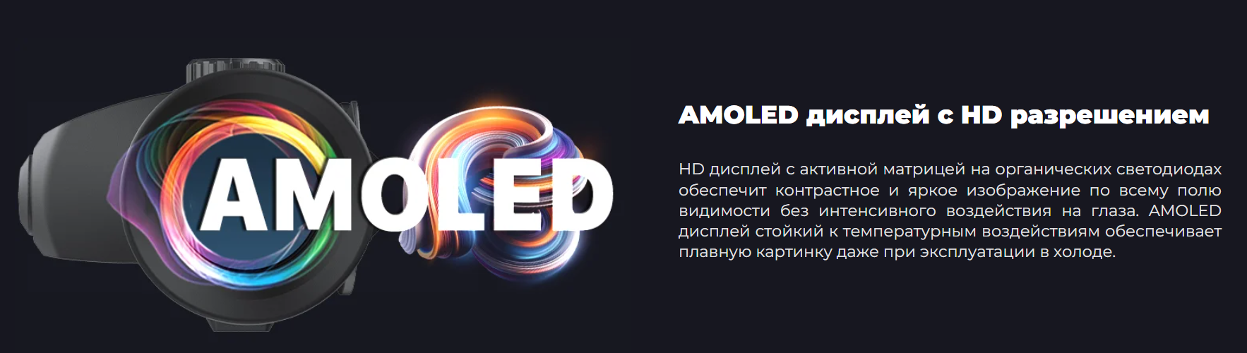 - Дисплей AMOLED с разрешением 1024×768 передаёт насыщенное изображение, устойчив к перепадам температур и не утомляет глаза.