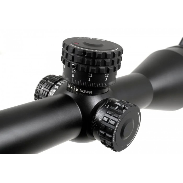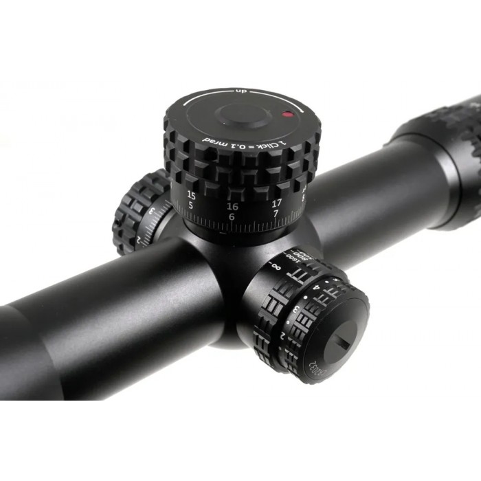Механика рассчитана на тактическую работу: установлены открытые барабаны с чёткими кликами. В описании указана цена клика ¼ MOA, при этом в технических характеристиках приведено значение 0,1 mil; в любом случае речь идёт о точной настройке с выраженной фиксацией делений, чтобы легче повторять настройки и не сбиваться при работе в перчатках. Запас регулировок заявлен на уровне до 50 MOA по вертикали и до 25 MOA по горизонту, а контроль оборотов реализован визуально — через индикатор/маркер, чтобы не ошибаться при переводе на дальние дистанции. Также заявлена функция Zero Stop для быстрого возврата к исходному «нулю», что особенно полезно, если приходится часто менять дистанции и затем возвращаться к базовой пристрелке.