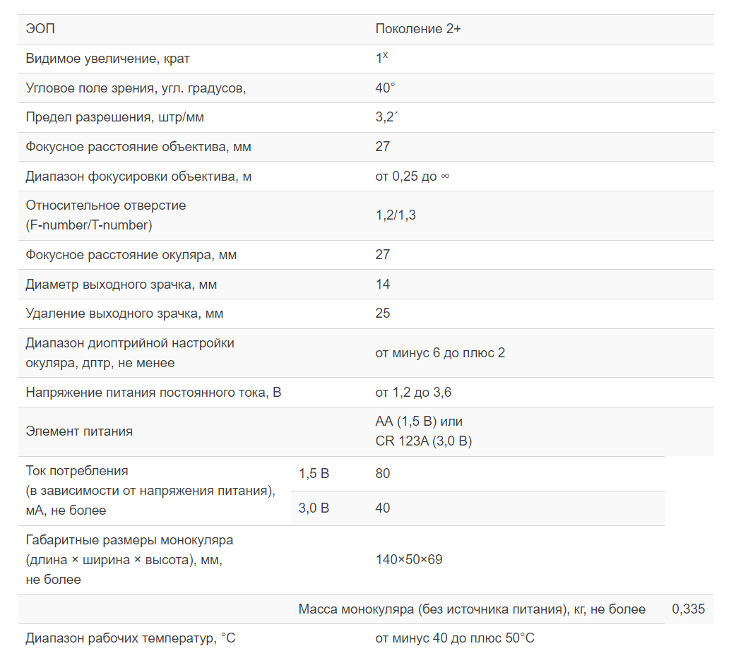 Модель используются отечественные электронно-оптические преобразователи поколения 2+. Монокуляр оснащен ИК осветителем с возможностью изменения угла подсветки, встроенной системой защиты с индикацией и автоматическим отключением прибора при избыточной освещённости, индикацией разряда батареи.