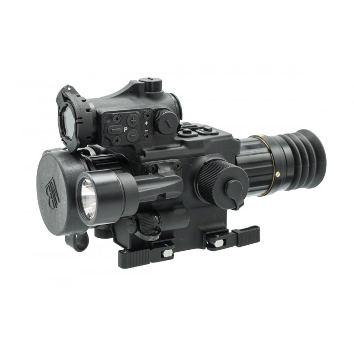 Питание осуществляется от одного аккумулятора формата 21700 с напряжением 3,7 В. Время автономной работы зависит от активных функций: до 12 часов при включённых тепловизоре и коллиматоре и до 45 минут при одновременной работе тепловизора, коллиматора, фонаря и зелёного ЛЦУ. В результате модель сочетает тепловизионное наблюдение, коллиматорное прицеливание, лазерное целеуказание и подсветку в одном корпусе, сохраняя компактные размеры и функциональность, востребованную при практическом использовании.
